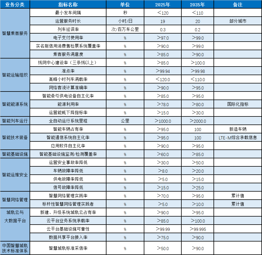 第一步:2025年,中国式智慧城轨特色基本形成,跻身世界先进智慧城轨国家行列。实现的总体目标是:中国城轨行业的信息化、智能化、智慧化水平进入世界先进行列,重点智能化关键核心技术得到应用,智能化产业初具规模。一是智能服务设施和智慧服务手段广泛应用,乘客满意度明显提高。二是智能运输组织水平显著提高,运输效率进入世界先进行列。三是全行业能源系统初步建立绿色建设运维体系,节能率普遍提高,进入国际先进行列。四是自主化列车全自动运行系统成熟完善并大面积推广应用,互联互通取得重大突破,具有自主知识产权的全自动运行系统开始进入国际市场。五是自主化的技术装备研发制造能力大幅提升,部分关键核心技术进入世界先进行列,LTE-M综合承载广泛应用,5G+取得实质性的推广应用,通信技术进入世界领先行列。六是智能线桥隧技术管理体系建立,基础设施的数字化和智能化达到世界先进水平。七是建立完善的全生命周期智能运维体系,车辆、能源装备及信号等专业系统实现普遍应用,运营维护和安全保障水平跻身世界先进行列。八是健全网络级管理平台,发挥网络层级功能优势,企业网络化管理体系初步建立,运营效率、管理能力达到国际先进水平。九是中国标准的城轨云和大数据平台建设初具规模,和世界新兴信息技术同步应用。十是智慧城轨技术标准体系基本形成,部分关键技术标准走向世界。第二步:2035年,进入世界先进智慧城轨国家前列,中国式智慧城轨乘势领跑发展潮流。实现的总体目标是:中国城轨行业的智能化水平世界领先,自主创新能力全面形成,建成全球领先的智慧城轨技术体系和产业链。一是建成世界领先的智慧乘客服务体系,乘客出行便捷、舒适、畅行。二是智能运输组织能力显著增强,运输效率进入世界先进前列。三是全行业绿色建设运维体系更加完善并取得显著成效,普遍采用绿色能源技术,全行业能源系统节能率大幅提高,达到世界领先水平。四是区域全自动、互联互通列车运行系统广泛应用,智能全自动运行系统关键核心技术进入世界前列。五是自主技术创新创优能力强盛,拥有世界著名自主品牌,主要关键核心技术装备达到世界领先水平。六是基础设施资源集约共享,数字化、全生命周期应用水平大幅度提高,关键技术应用进入世界领先行列。七是智能运维安全保障体系健全完善,全行业运营安全和设备保障等指标达到世界领先水平。八是持续完善网络管理体系和平台,企业网络化管理体系健全完善,运营安全、服务品质和综合效益和网络化管理水平跨入世界前列。九是城轨云与大数据平台实现行业全覆盖、应用业务全覆盖,以城轨云为标志的新一代信息技术应用进入世界领先行列。十是自主化智慧城轨技术标准体系完备,关键技术标准纳入国际标准序列,形成以智慧城轨系列规范引领城轨行业的态势,总体水平处于国际引领地位。在总体目标指导下,聚焦提高系统安全可靠性、提升网络生产效率、完善综合服务水平、提高社会效益和经济效益等目的,制定以下具体目标(量化目标详见附件1:智慧城轨实现目标和路径表):2025年目标:智能售检票的实名制乘车、生物识别、无感支付、语音购票等普遍采用,各城市间乘车畅行无阻,智能票、检合一的新模式普遍应用;智慧车站的自动开关站、语音问询、信息服务、动态引导、环境调控等服务功能齐全;智能列车的信息服务温馨实用、个性化需求多样完善;紧急情况下智能管理、引导与应急疏散客流,乘客服务安全有序;智能线网运力服务精准匹配、安全、快捷、高效。2035年目标:新兴信息技术和城轨乘客服务全面融合,建成无感进出站、舒适便捷乘车、安全正点通达、网内换乘高效、网外衔接顺畅、智慧服务覆盖的世界领先的智慧乘客服务体系。2025年目标:基本建立面向城市轨道交通网络化运营的智能运输组织理论,部分都市圈、城市群实现轨道交通网络化运营;部分城市建成基于共享数据、智能设备、智能软件的网络化运输组织系统平台,实现客流分布的实时预测、运输计划的智能化编制、运力与客流的精准匹配;智能调度与应急指挥中心深度融合,初步建成智能化线网运输组织辅助决策系统;智慧车站技术装备及运控体系推广应用;部分城市实现市区城轨、市域快轨、城际铁路“三网融合”,运输效率和智能化水平进入世界先进行列。2035年目标:以智能化辅助决策系统为核心,实现线网运输组织的预测精细化、管理信息化和决策智能化,实现都市圈、城市群轨道交通网络高效智能运转;在市区城轨、市域快轨、城际铁路“三网融合”的基础上,实现城轨交通与铁路、公交、航空等其他运输资源的优化配置、运力匹配和联动调度,有机融入国家现代化综合交通运输体系;运输效率和智能化水平进入世界先进前列。2025年目标:构建自主化轨道交通能源系统智能装备产业链,电能质量优化控制技术得到全面推广;再生制动、新能源等能量综合管理与再利用技术得到广泛推广应用;建立能耗-客流实时耦合模型和能源“供-用”评价评估体系;设备状态监测技术深度应用,建立智能化的故障预警系统;建立以关键设备在线故障监测和诊断为基础的智能运维和能源系统设备健康管理标准并示范应用;全行业能源系统节能率普遍提高,进入国际先进行列。2035年目标: